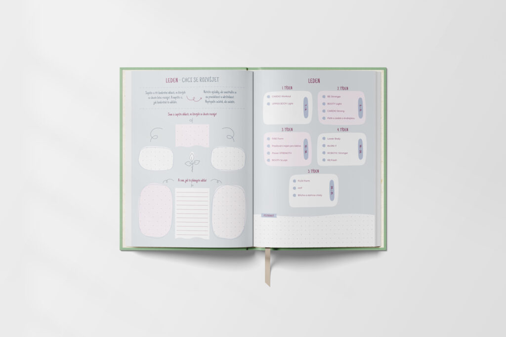 - měsíční přehled – na začátku každého měsíce je na dvojstraně tabulka pro zaznamenávání sportovních aktivit, důležitých milníků v měsíci, narozenin nebo čehokoli dalšího, co vás napadne,