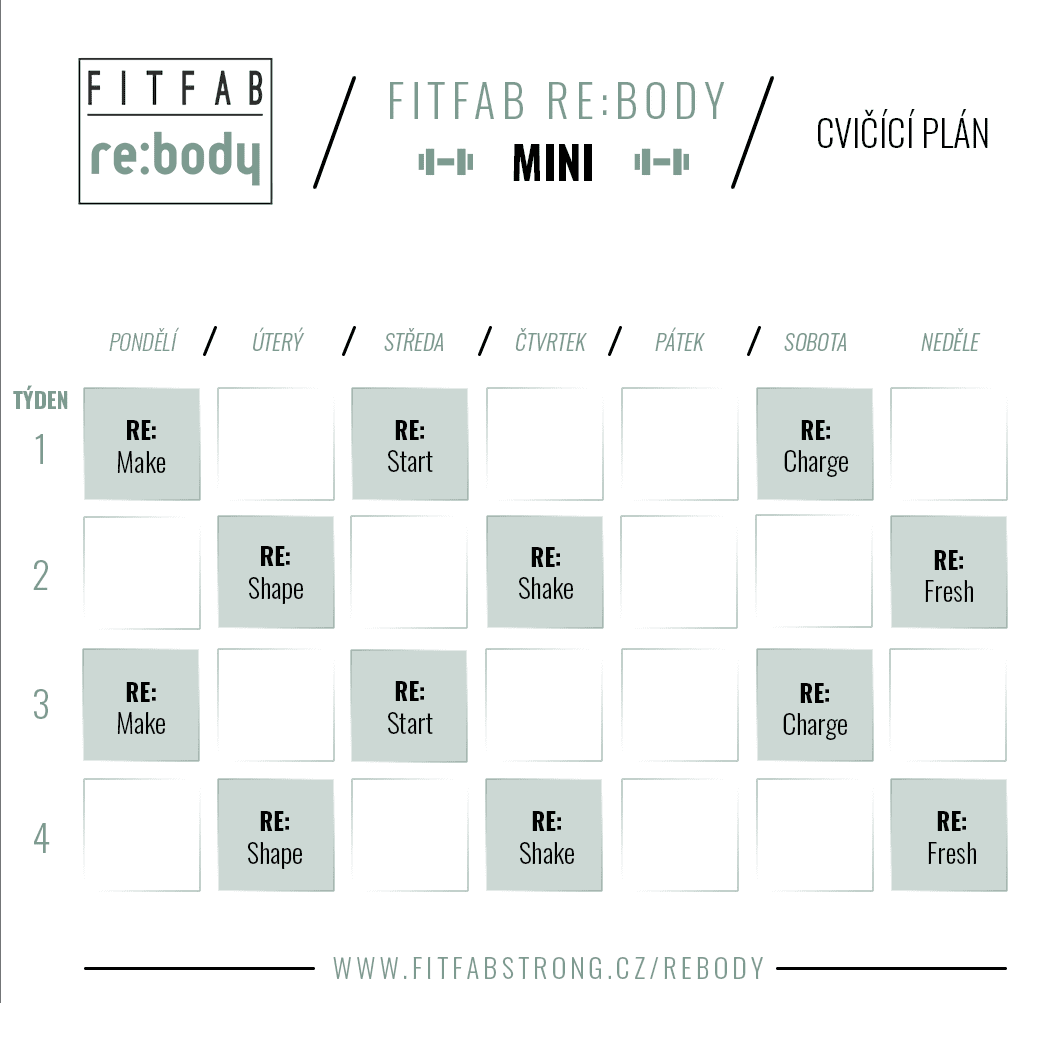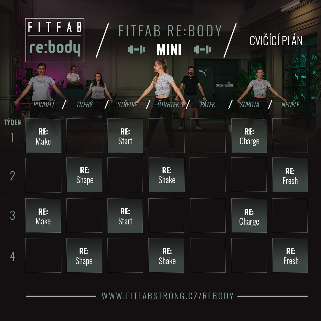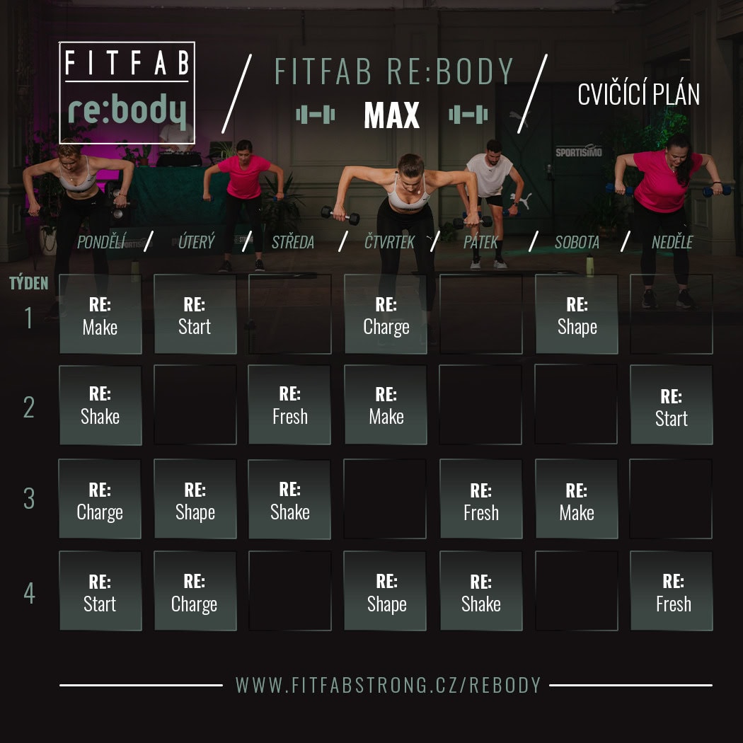 Program FITFAB RE:Body je vaše terapie pohybem – ať už potřebujete vybít negativní emoce, uvolnit stres či se zklidnit po náročném dni. Soustřeďte se primárně na sebe, vnímejte vědomě své tělo a nechte se vést pohybem. Lekce jsou vhodné především pro středně pokročilé až pokročilé cvičící, avšak začátečníci určitě odcvičí s využitím lehčí varianty.