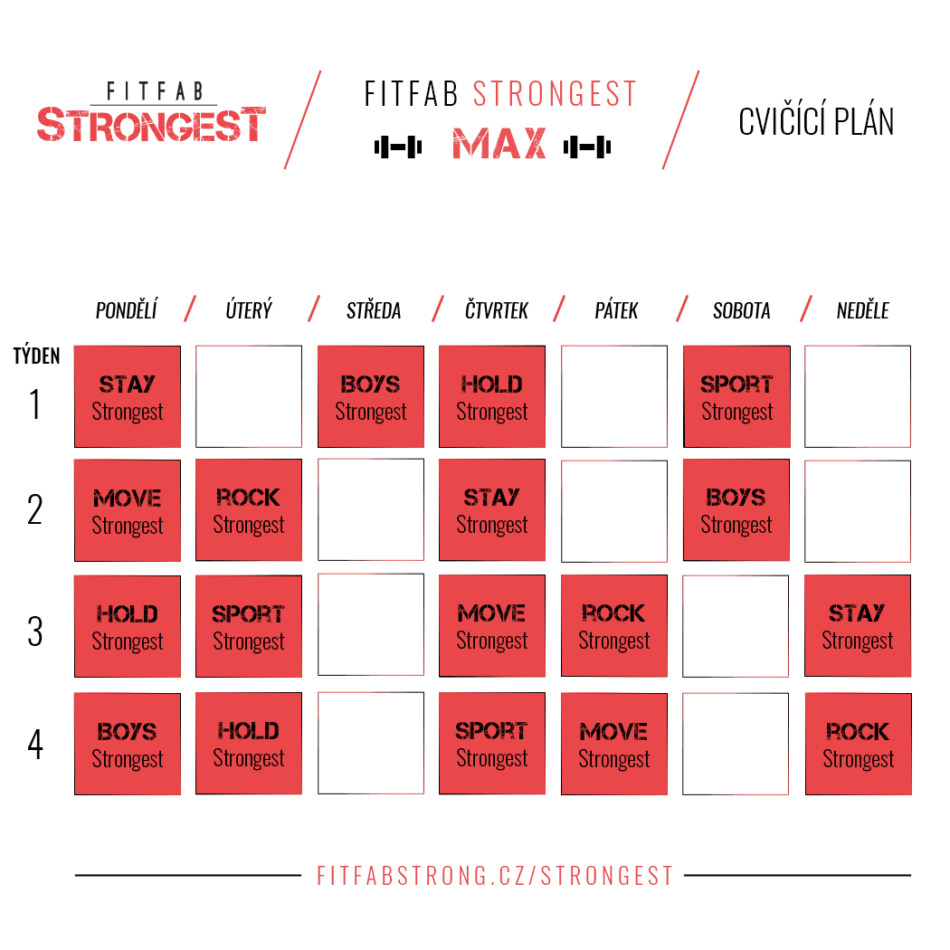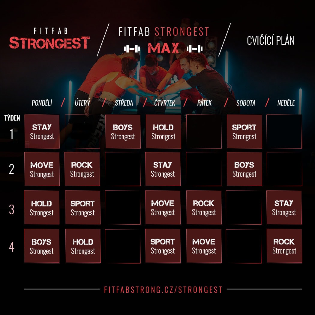 FITFAB Strongest obsahuje lekce, které uspokojí i ty nejnáročnější. Náročné kardiové i silové kombinace, 40 až 50minutové lekce a maximální účinek. Videa využívají tradičnějších i méně tradičních pomůcek – expander, jednoruční činky a paličky (vařečky) pro taneční lekci.