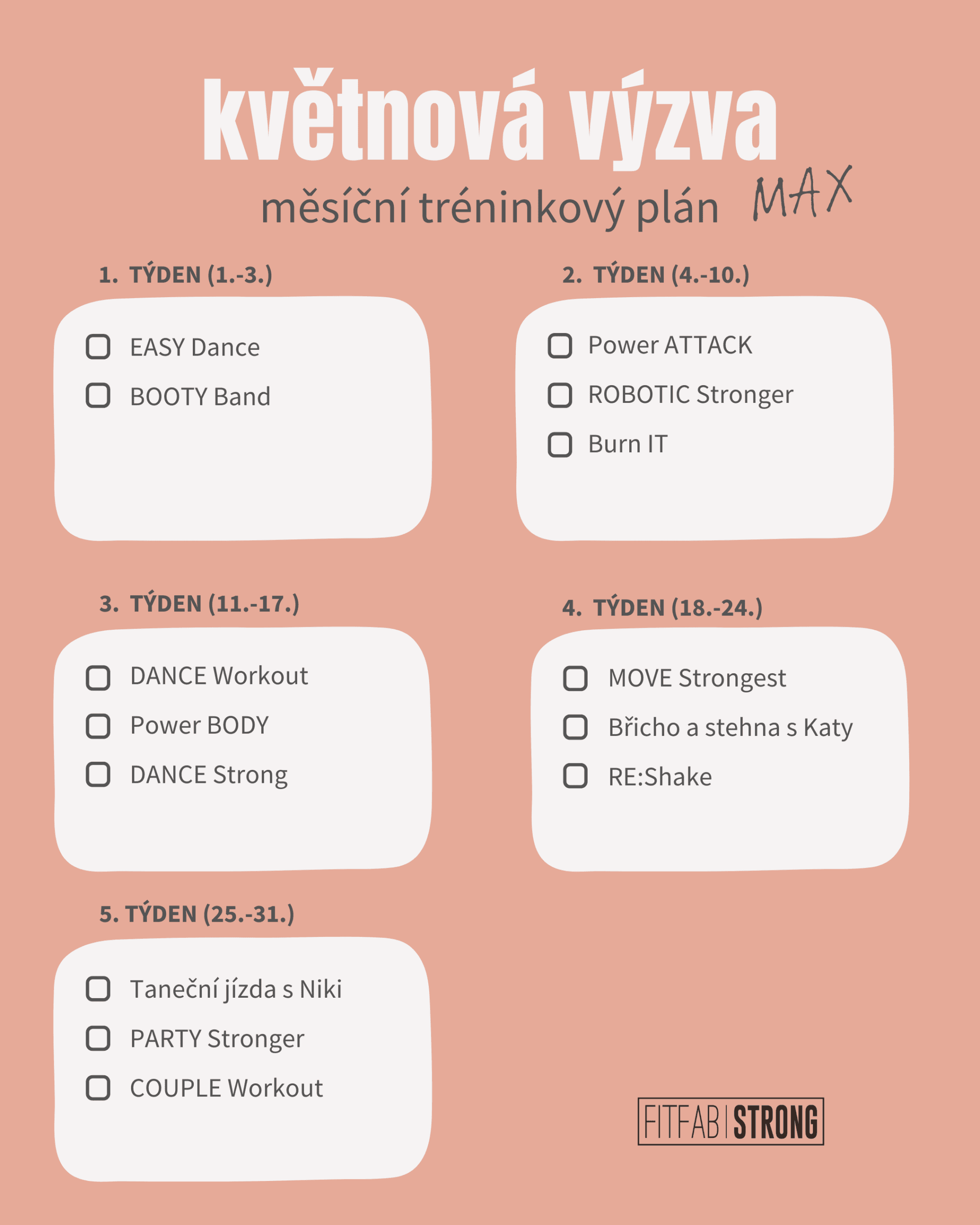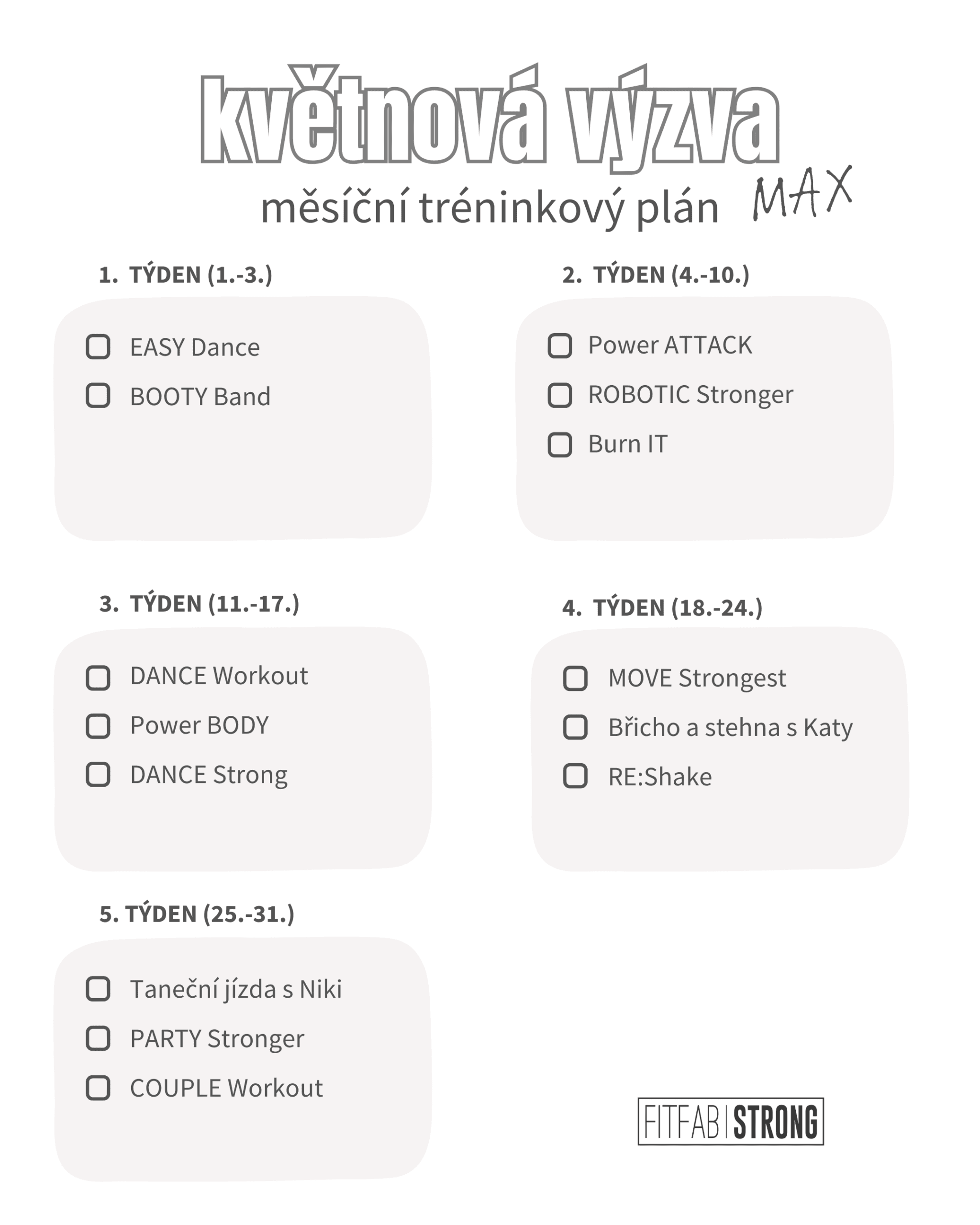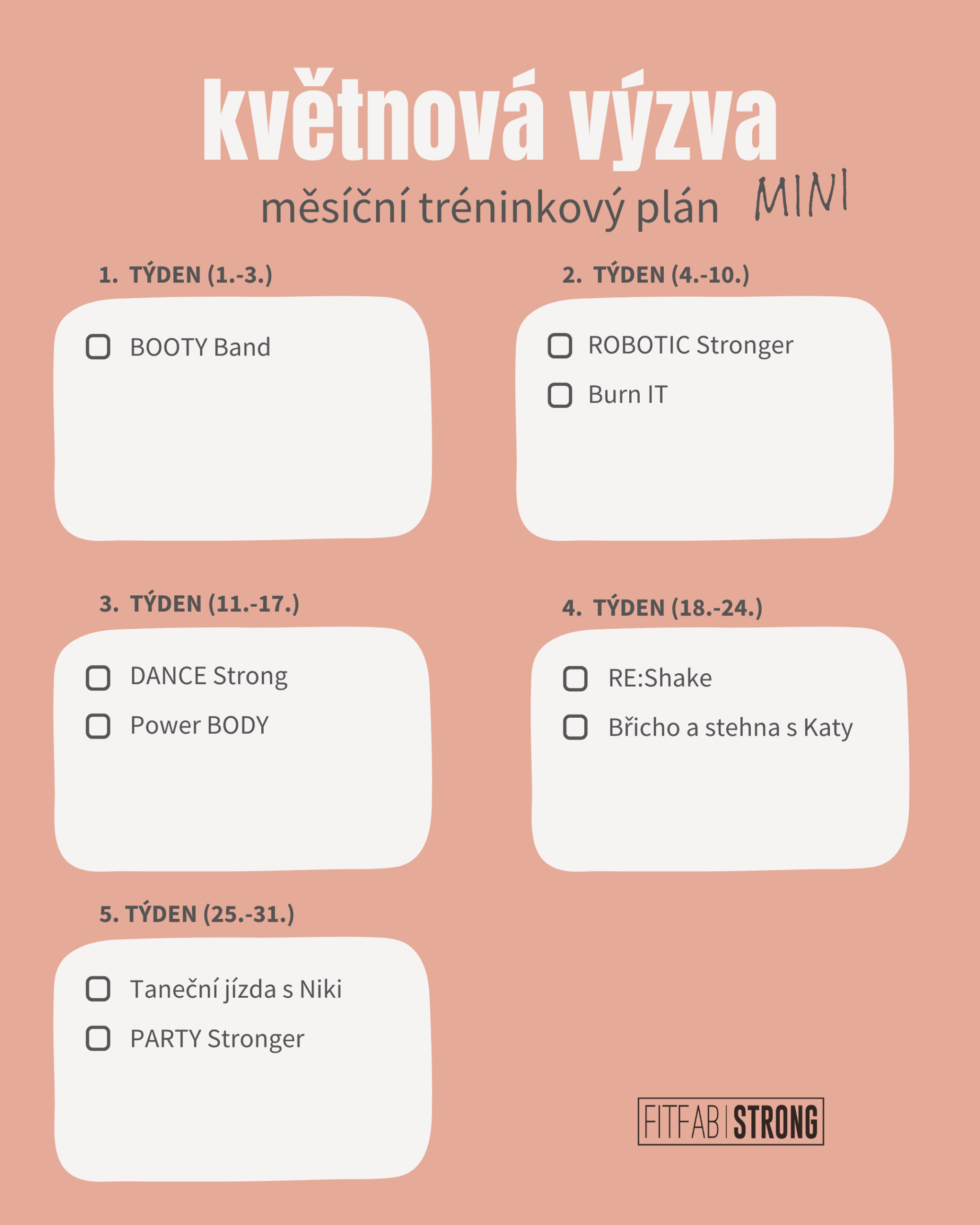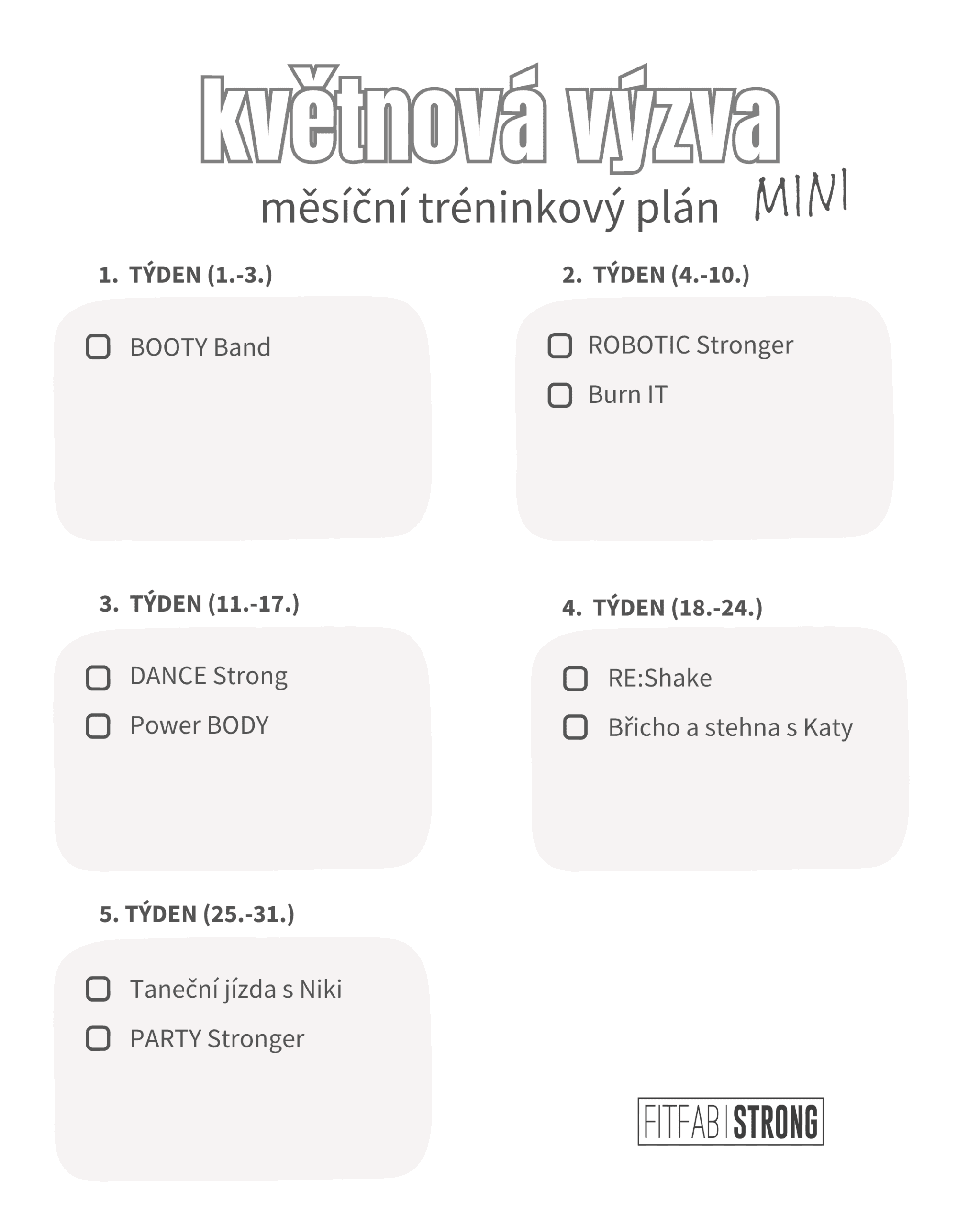 Výzva i tréninky jsou součástí FITFAB Diáře, našeho papírového fitness pomocníka. Pokud patříš mezi ty, co milují papír, zvýrazňovače a pocit, kdy si můžeš reálně odškrtnout splněný trénink, je tohle volba pro tebe.