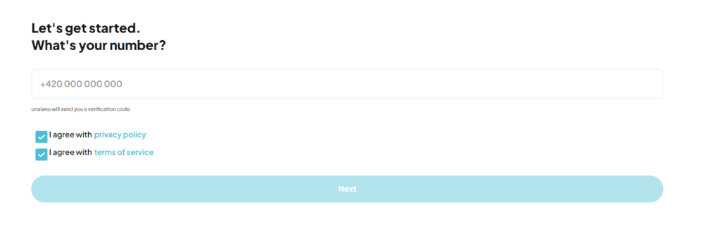 - Vyplňte své telefonní číslo včetně předvolby, zaškrtněte obě políčka a klikněte na Next.