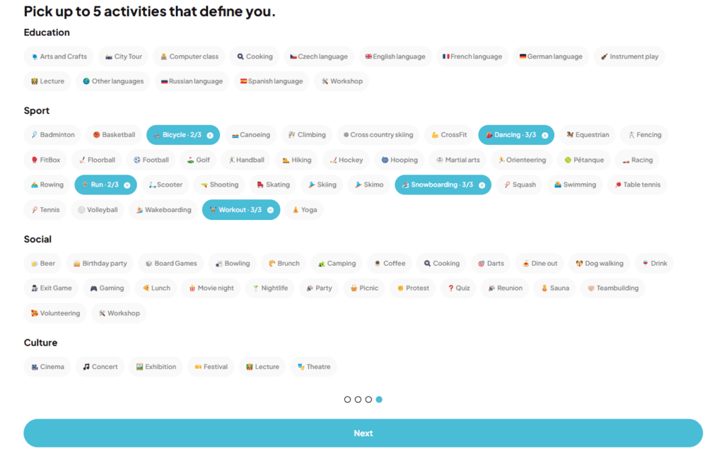 - Mezitím si z nabídky na ploše vyberte pět zájmů (snadno vyberete i podle emotikonů) a svou pokročilost (beginner – začátečník, intermediate – mírně pokročilý, experienced – pokročilý).