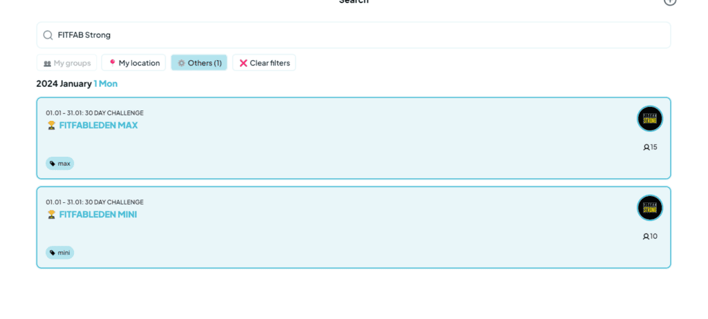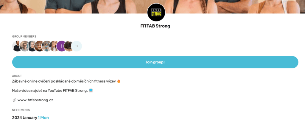 Do řádku napište FITFAB Strong a objeví se vám aktuální fitness měsíční výzva. Nejprve klikněte na ikonku FITFAB Strong a otevře se vám náš profil. Pomocí tlačítka JOIN GROUP se k nám můžete přidat.