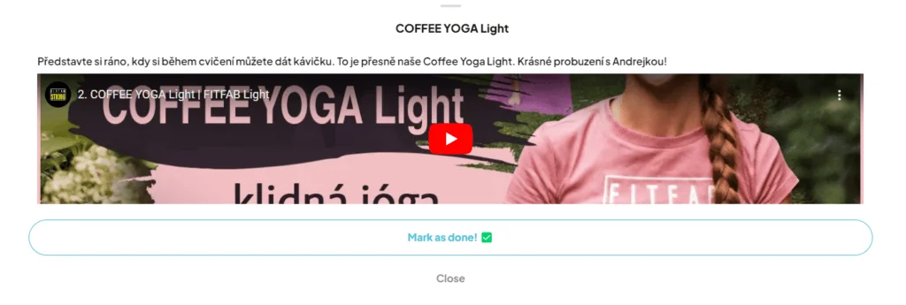 Po odcvičení si lekci odškrtněte jako hotovou pomocí tlačítka MARKED AS DONE a v dalším kroku pomocí emotikonu můžete označit, jak jste se při cvičení cítili.