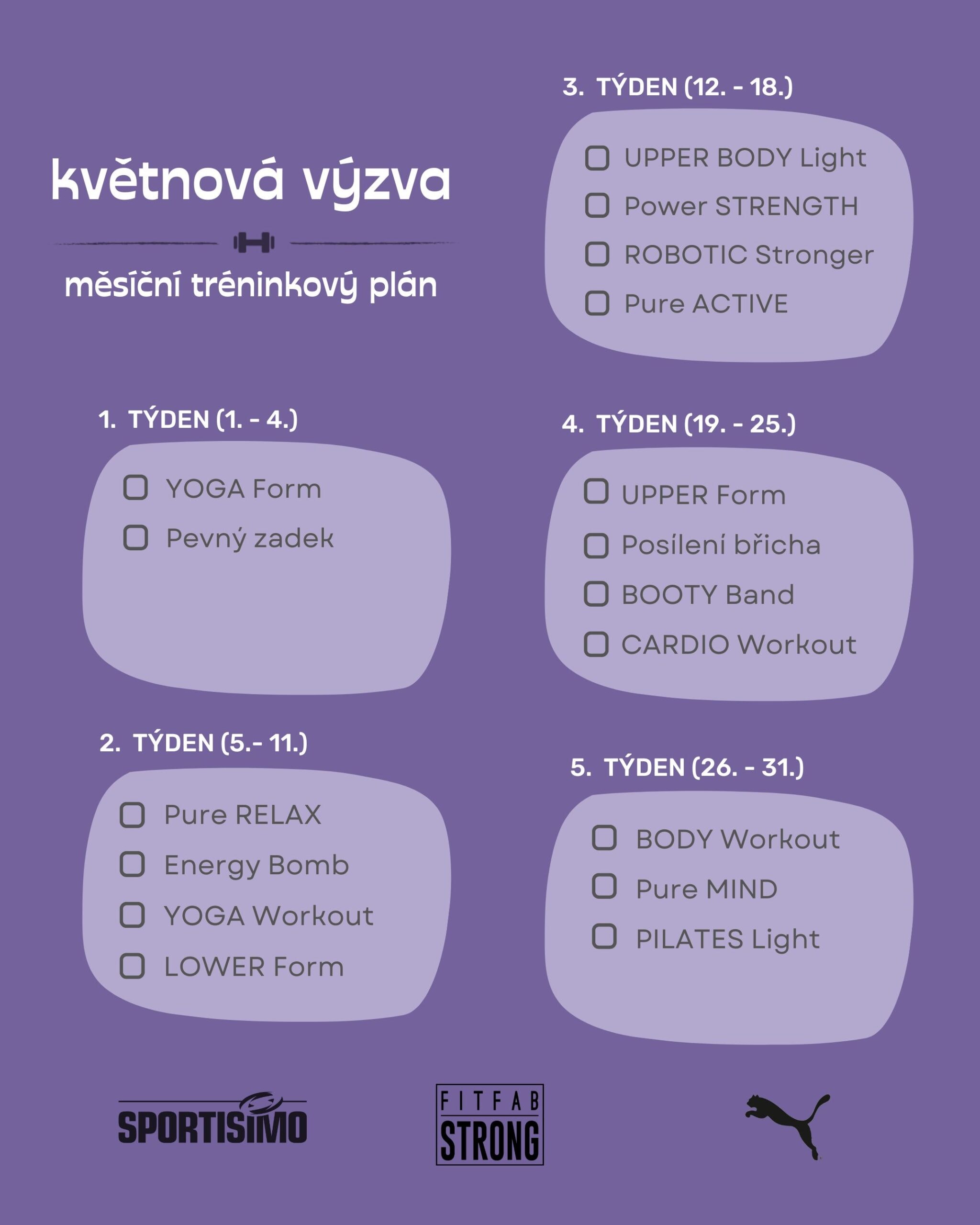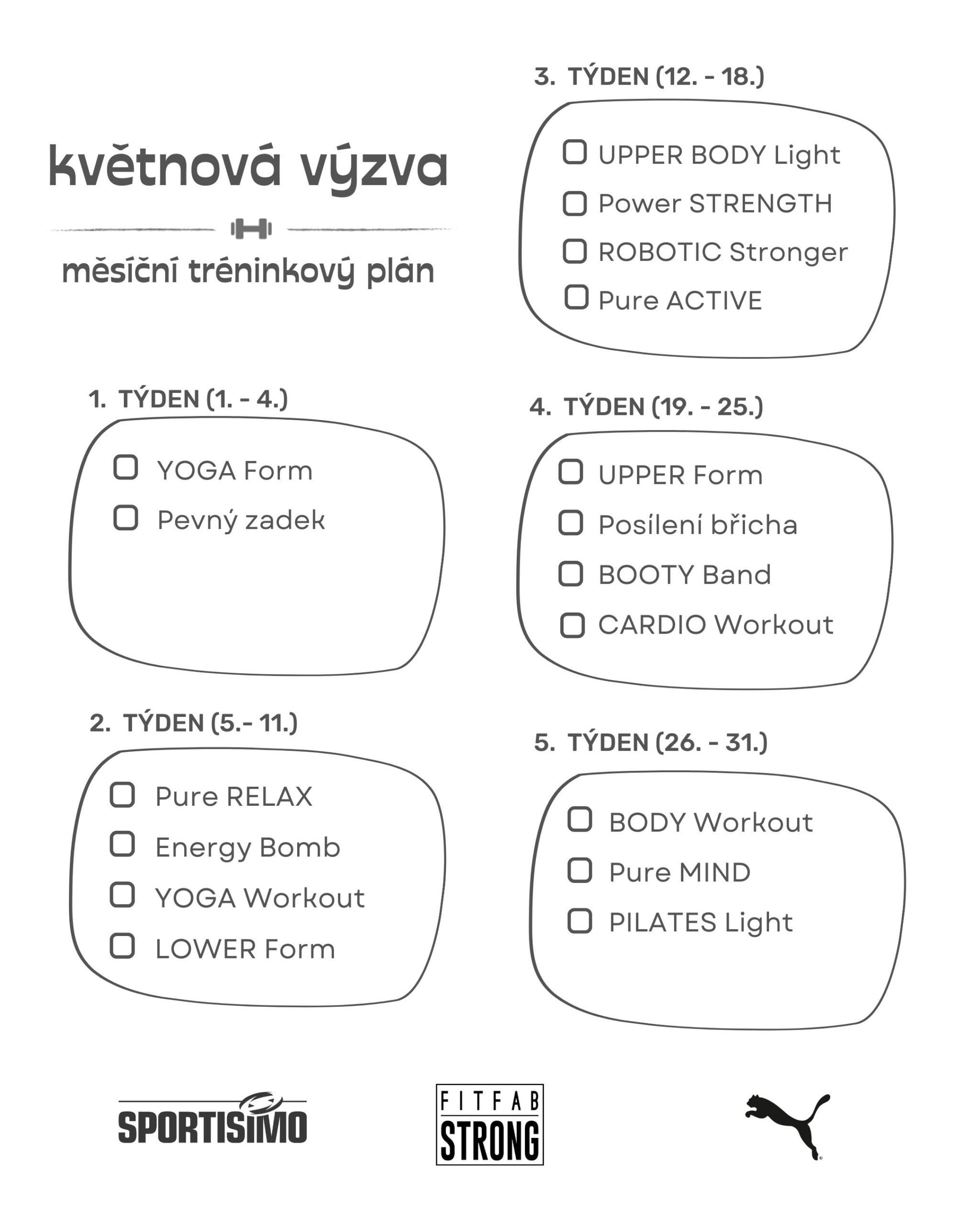 Plánky si můžete stáhnout a odškrtávat – barevnýčernobílý. Výzvu najdete také v našem FITFAB Diáři 2025 a aplikaci Unalanu. ✅