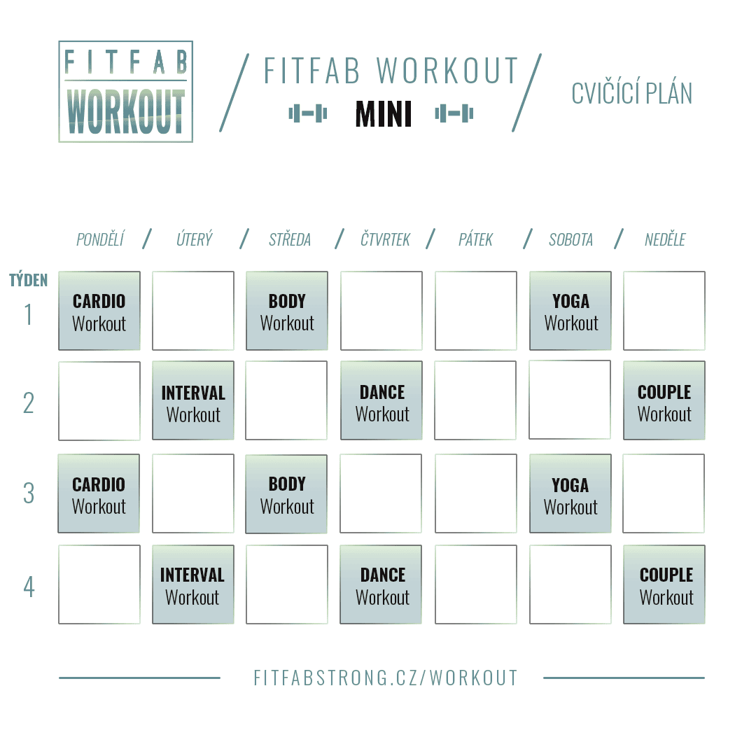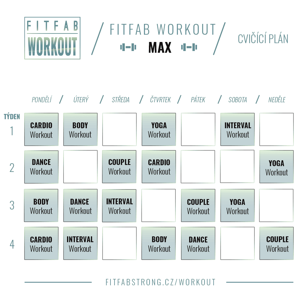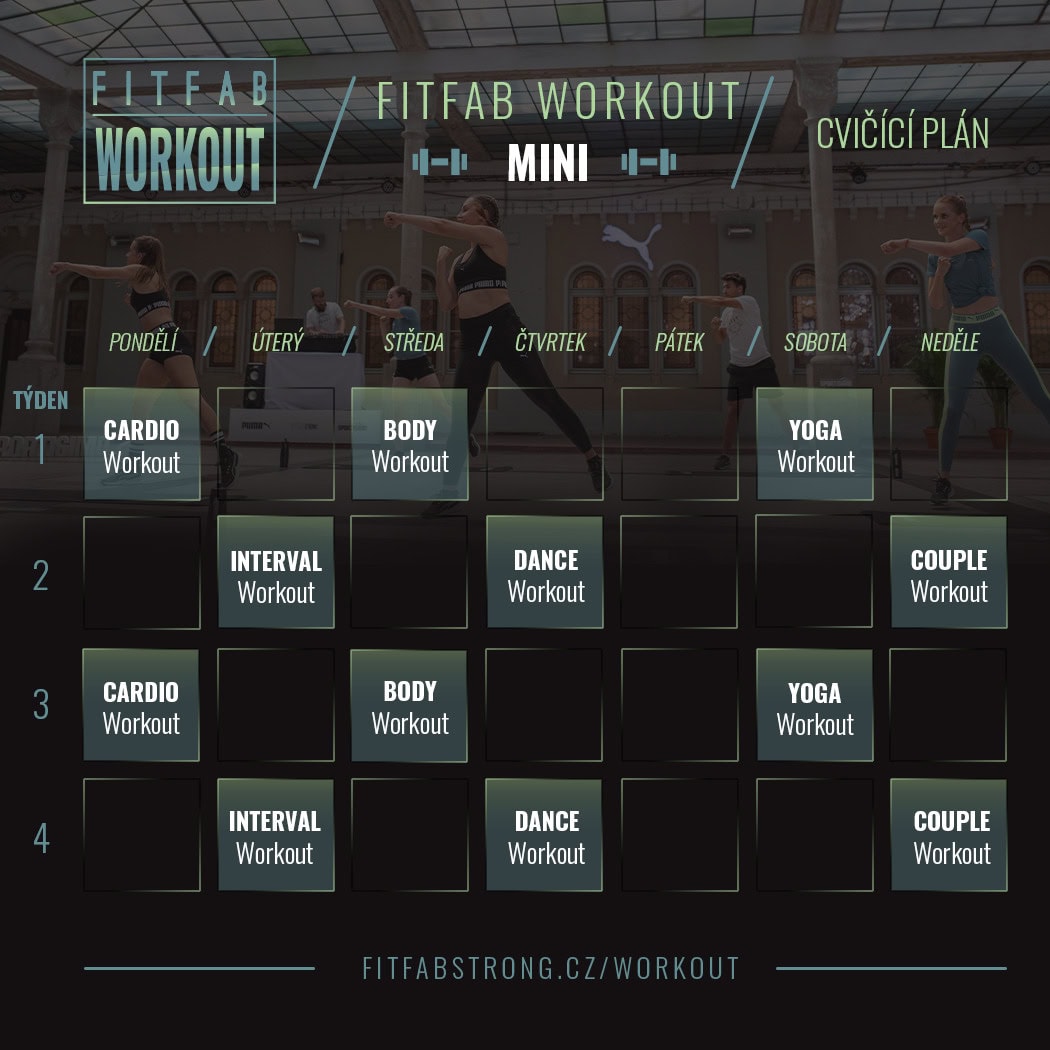 FITFAB Workout je program, který nabízí variabilitu v každé lekci. Výbušné kardio, silový trénink s jednoručními činkami, dynamická jóga, intervalová lekce, tanec či couple workout – silový trénink pro dva. Lekce jsou delší a výživné. Program je vhodný pro středně pokročilé až pokročilé.